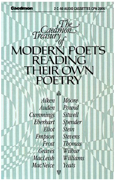 Two cassettes, liners and cases in excellent condition.A choice gathering of some of the 20th century's greatest poetry makes for a rare and thrilling listening experience when they are read by the authors themselves. Selections from T. S. Elliot, William Butler Yeats, William Carlos Williams, Conrad Aiken, W.H. Auden, e.e. cummings, Richard Eberhart, William Empson, Robert Frost, Robert Graves, Archie MacLeish, Louis MacNeice, Marianne Moore, Ezra Pound, Edith Sitwell, Stephen Spender, Gertrude Stein, Wallace Stevens, Dylan Thomas, Richard Wilbur, William Carlos Williams.